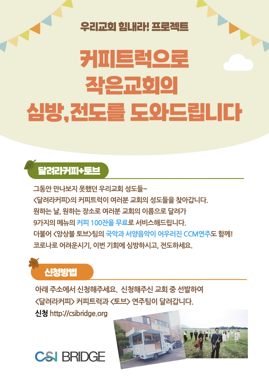 코로나로 인해 닫혀있었던 또 소통하지 못했던 교회. 사람들에게 찾아갈수도 없고 사람들이 복음을 듣기 위해 교회로 올수도 없었던 안타까운 상황으로 1년을 넘게 보냈습니다. 저희가 여러분 교회의 전도를 돕겠습니다. 안전한 거리를 유지한 채 커피와 음악을 들을 수 있는 <달려라커피>의 멋진 커피트럭과 <앙상블토브>의 연주가 찾아갑니다.