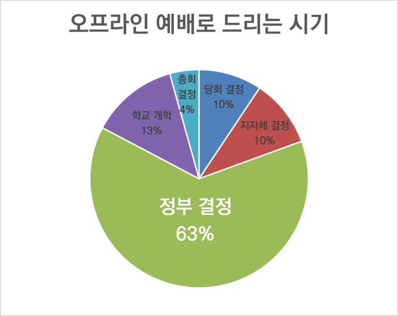 언제까지 온라인으로 예배를 드리게 될지를 묻는 질문에, 정부의 결정에 따르겠다는 대답이 63%나 되었습니다. 지자체의 결정에 따른다는 대답까지 포함하면 73%가 코로나19의 종료상황을 정부와 지자체의 공식적인 결정사항을 존중하며 그에 따라 대처하겠다는 것으로 보입니다.