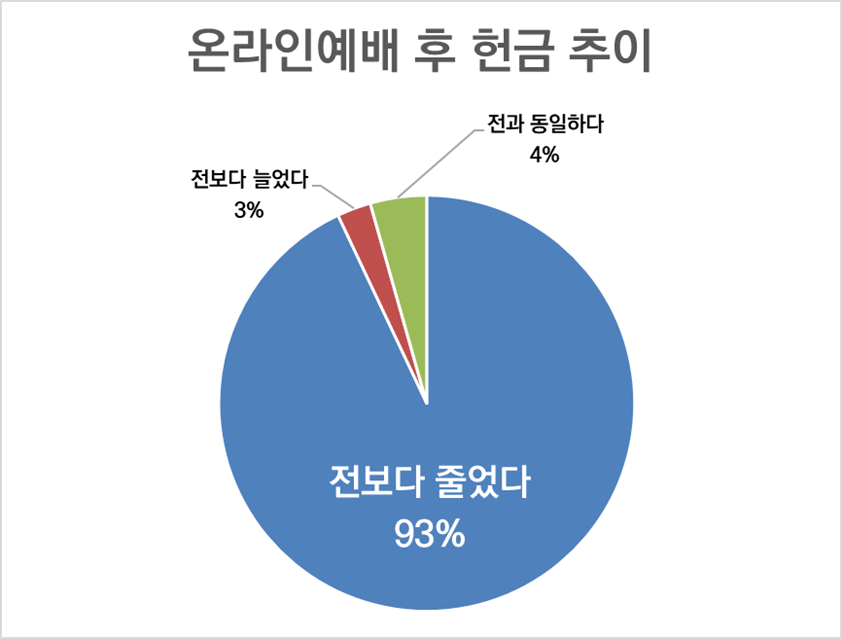 온라인예배로 드릴 경우, 염려되었던 부분중의 하나가 헌금 감소였습니다. 온라인으로만 예배를 드리면, 헌금을 계좌이체하는 것에 대한 어색함, 그리고 노년층의 온라인결제에 대한 친숙하지 못한 부분들이 영향을 끼칠 것으로 예상되었는데, 역시나 온라인예배시 헌금이 이전보다 줄었다는 응답이 93%나 되었습니다.