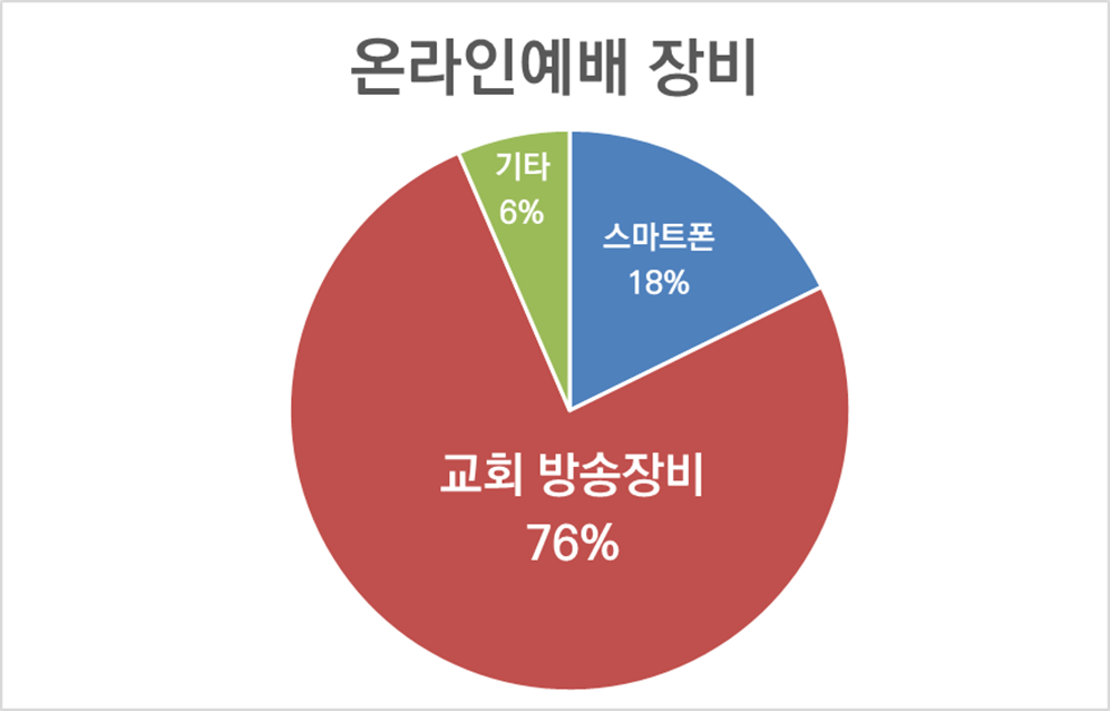 76%의 교회가 교회의 방송장비를 통해서 온라인예배를 중계하였습니다. 스마트폰을 통해서 중계를 한 교회는 교회내에 중계시스템이 없는 소형교회였을 것으로 보입니다.
